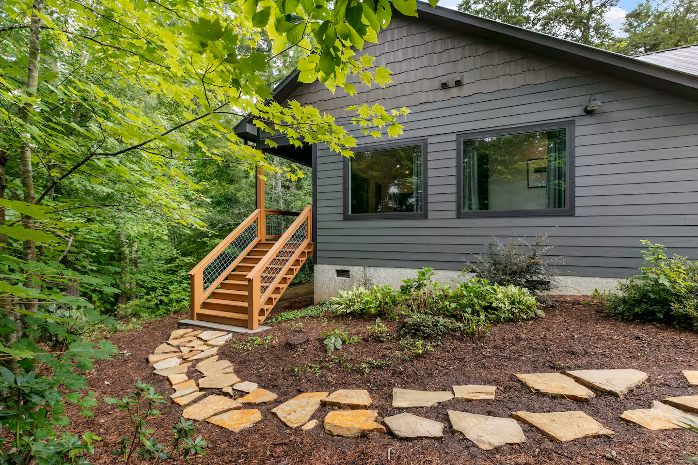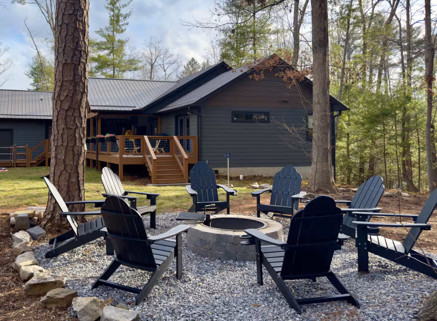 Just two miles from downtown Asheville yet tucked into almost an acre of woodland, Nanas Branch blends upscale design with the rustic beauty of the Blue Ridge Mountains. Start your morning with coffee on a forest‑view deck and end your evening soaking in a six‑person hot tub under twinkle lights and stars. Professionally designed interiors feature new furnishings, a gourmet kitchen with granite counters and high‑end appliances, and a living room with vaulted ceilings, stone fireplace and 4K smart TV. Outside, multiple fireplaces, a BBQ grill and a fire pit invite you to gather amid the trees while still being close to Asheville’s dining and nightlife.