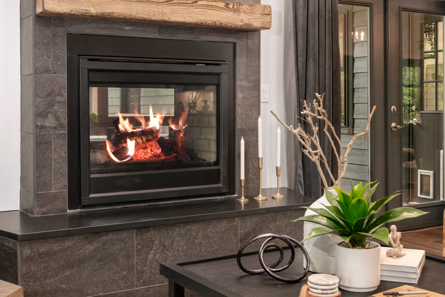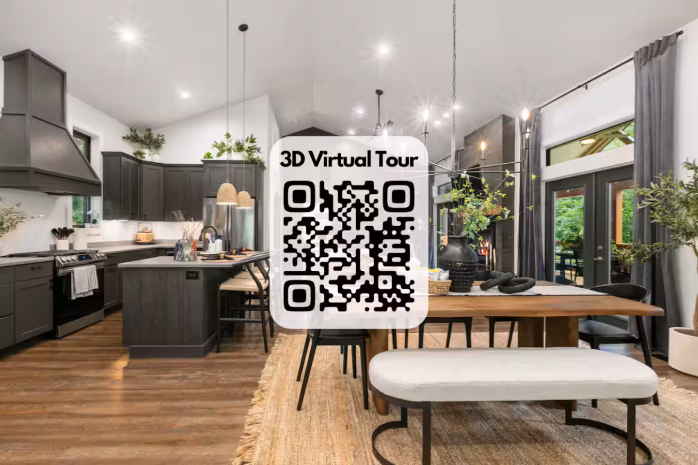 The sun‑filled kitchen flows into a dining area for eight and a living room furnished with a plush sectional, soft blankets and a stone gas fireplace—ideal for movie nights or board‑game marathons. Ceiling fans, area rugs and hardwood floors add comfort. Bedrooms are furnished with hotel‑quality mattresses, crisp linens and smart TVs. The master suite includes a spa‑style bathroom with a walk‑in shower featuring multiple sprayers and a live‑edge wood vanity. Two additional bathrooms provide rainfall showers and ample counter space.