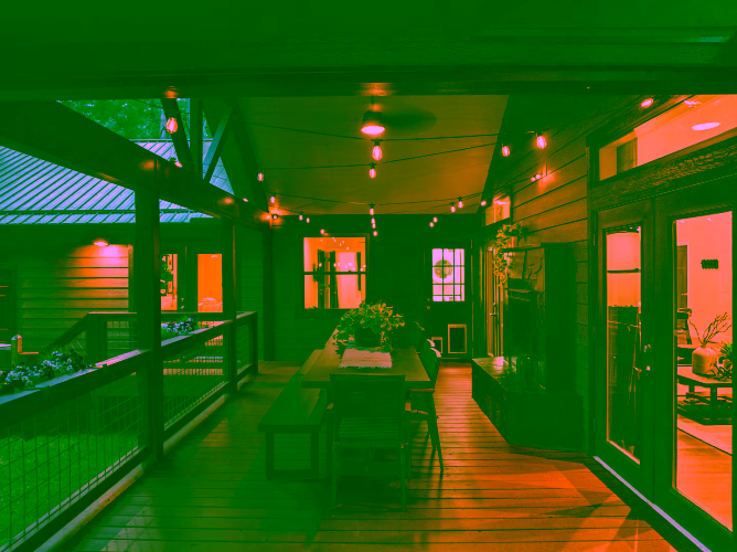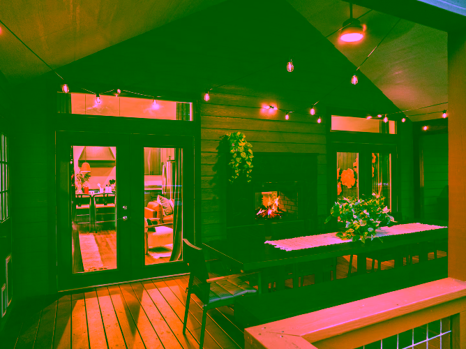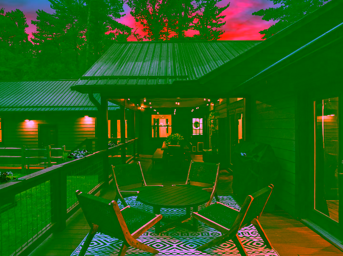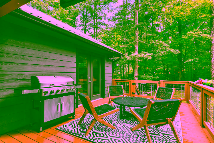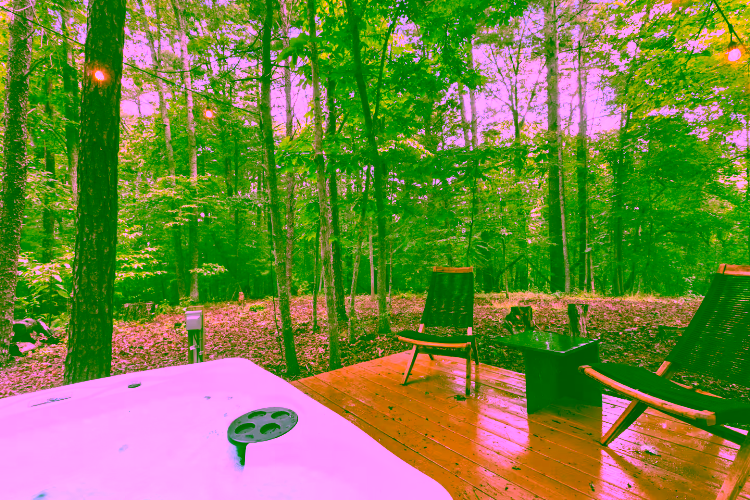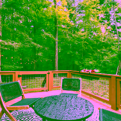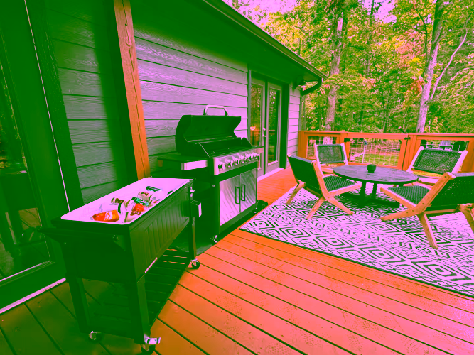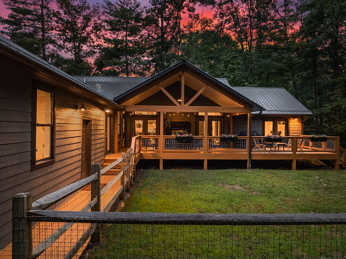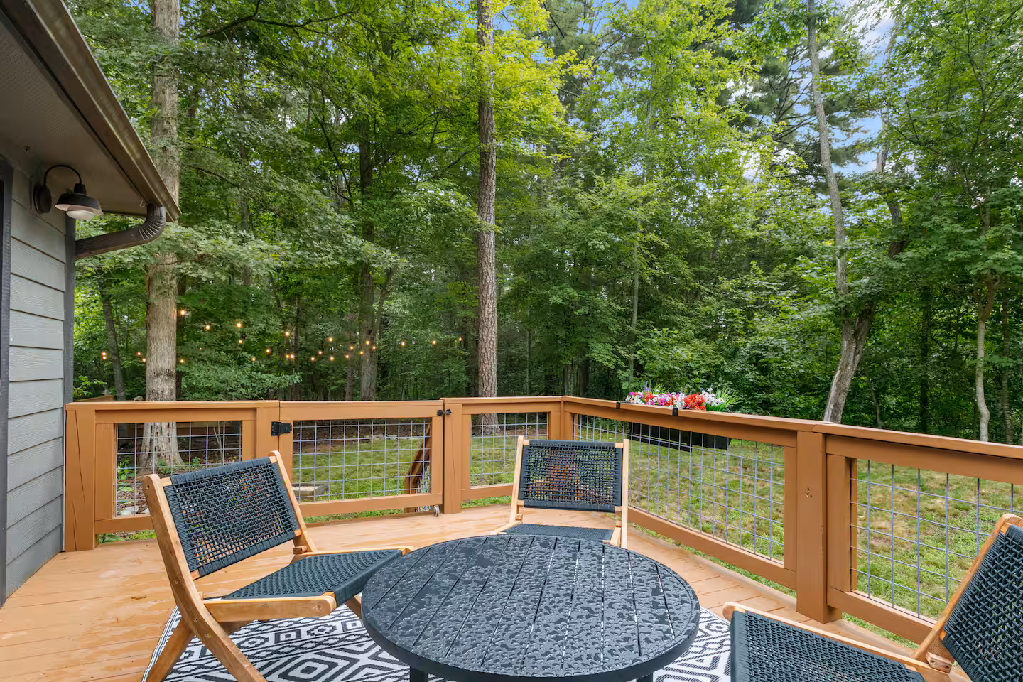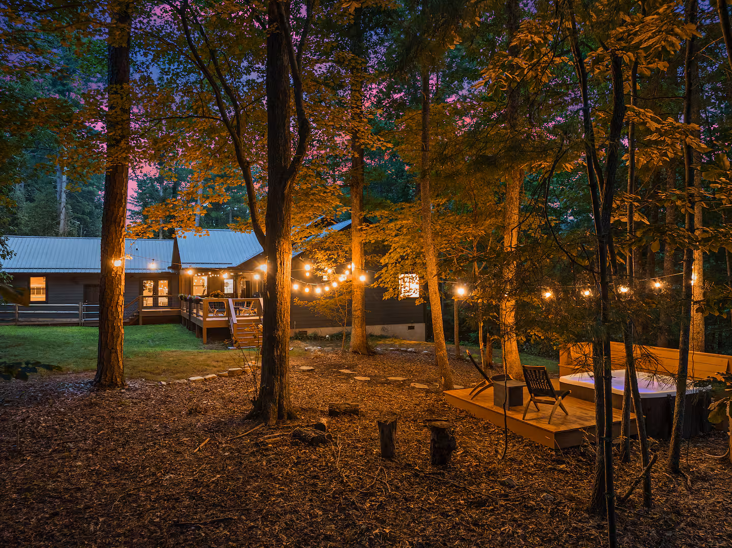 Step onto the deck to dine al fresco next to a double‑sided gas fireplace, then move to the adjoining seating area for after‑dinner drinks. In the yard, a fire pit ring with mountain views seats eight—perfect for roasting marshmallows under the Milky Way. A separate deck, nestled among tall trees, houses the six‑person hot tub for relaxing after hiking the Blue Ridge Parkway or exploring local breweries. Lawn games, string lights and surrounding forest create a magical outdoor playground.