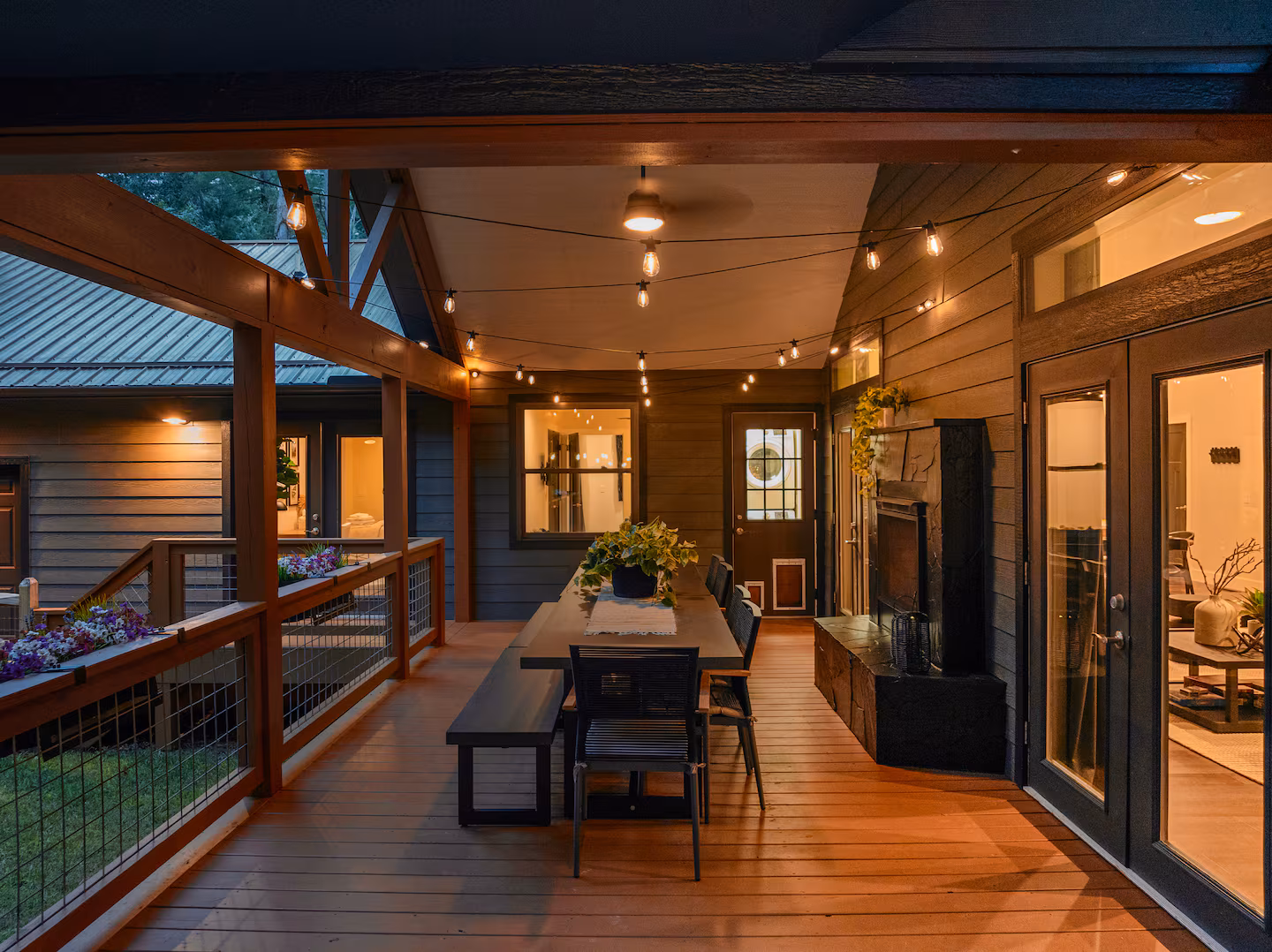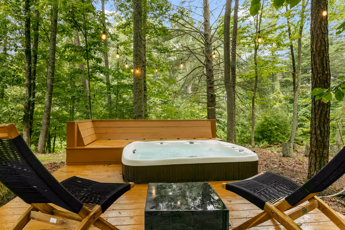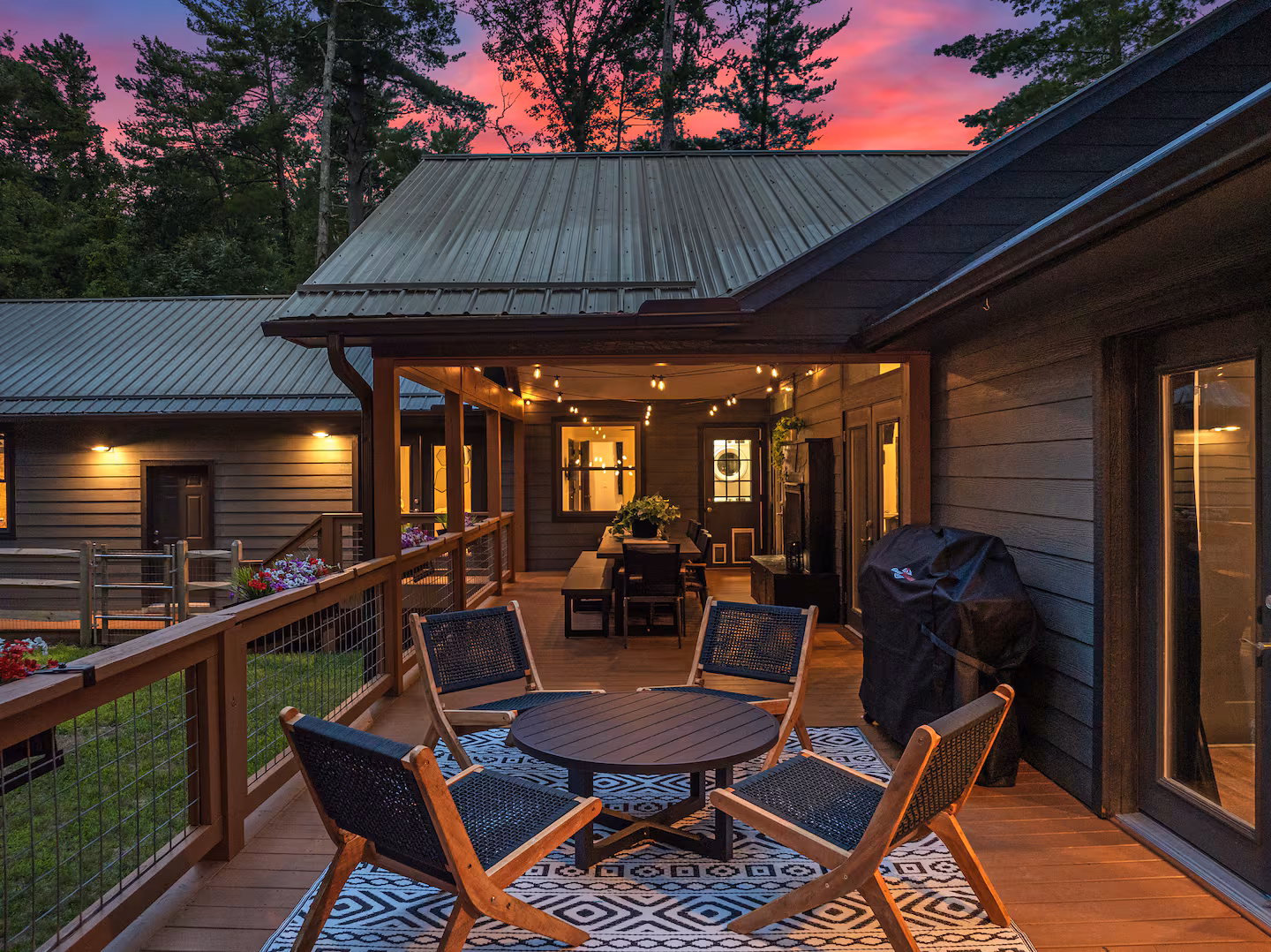 Outdoor living: Expansive deck with dining for ten and a two‑sided gas fireplace; separate conversation area; propane grill; ambient string lights; six‑person hot tub; large fire pit with seating for eight; and lawn games like giant Connect Four, corn hole and disc golf.
